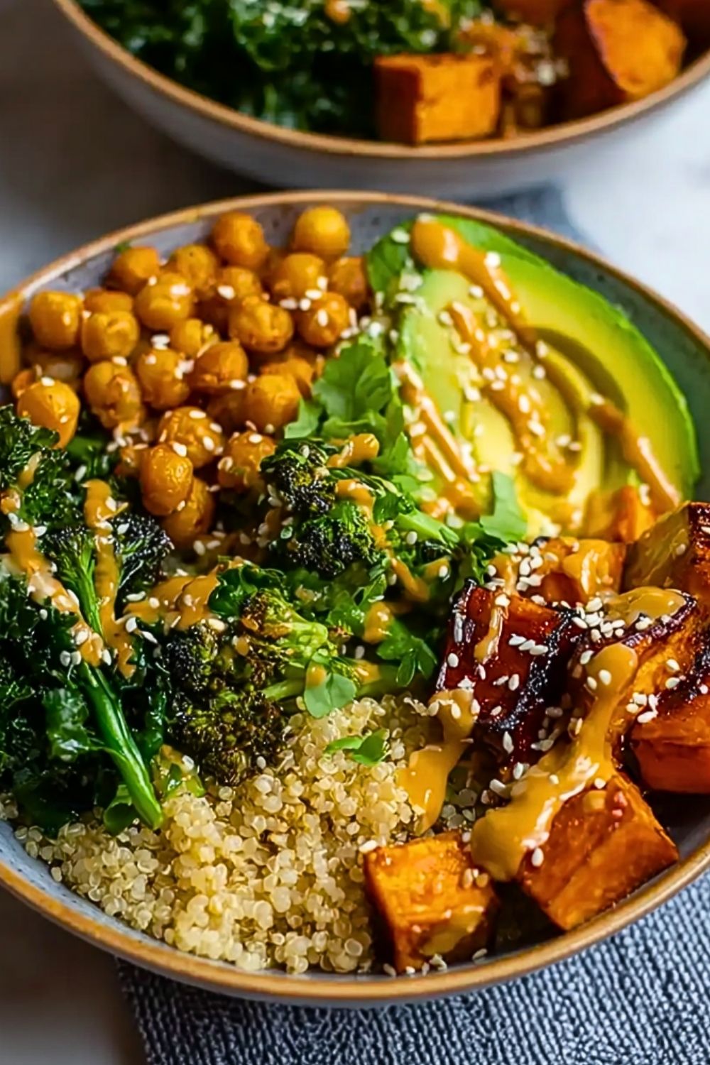 9. Assemble the bowl: quinoa base, then arrange sweet potatoes, chickpeas, broccoli, carrots, kale, and avocado.