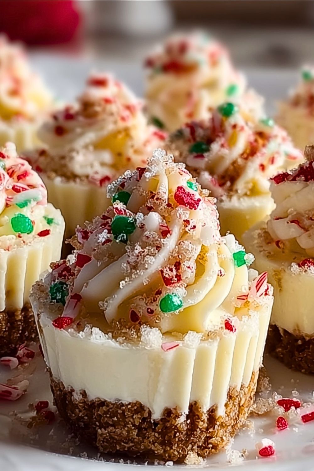 Before serving, pipe or dollop whipped cream onto each mini cheesecake. Decorate with red and green sprinkles, crushed peppermint, or white chocolate shavings for a festive holiday look.