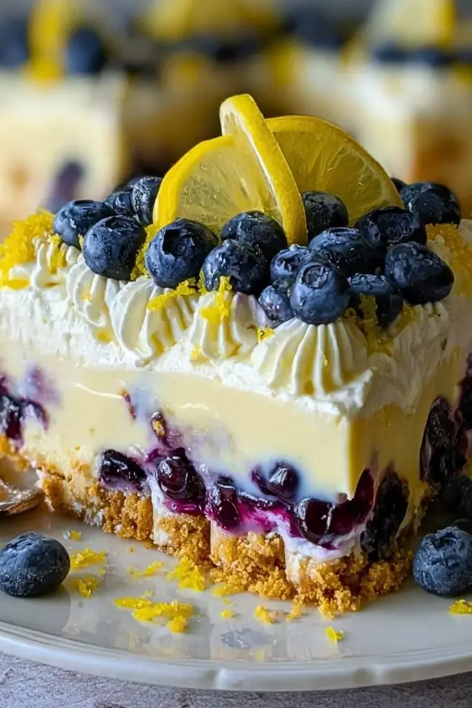 What draws me to this cake is the contrast of flavors and textures. The buttery graham cracker crust gives way to a lush lemon-cream filling studded with juicy blueberries. A layer of lemon pudding brings extra zing, while whipped cream and more berries on top add both beauty and balance. Whether you're prepping for a picnic, brunch, or just looking for something sweet and cold during the summer heat, this cake fits the bill perfectly.