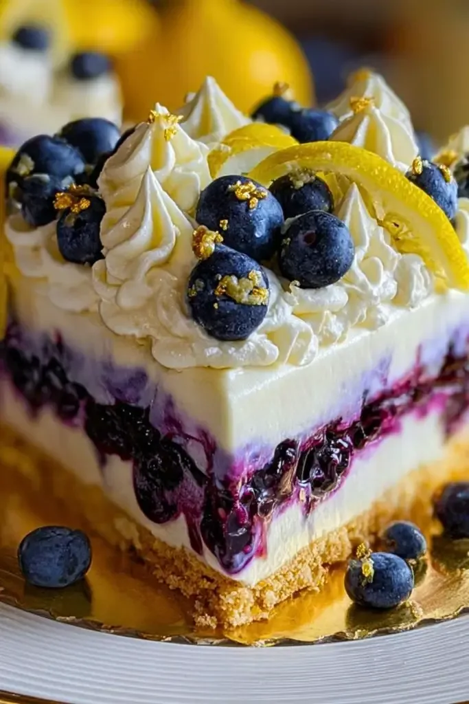 This No-Bake Lemon Dazzling Blueberry Cream Cake is a refreshing, sunshine-filled dessert made with layers of graham cracker crust, lemon-kissed cream cheese filling, vibrant lemon pudding, and juicy blueberries. It’s the ultimate easy recipe for warm weather, perfect for quick breakfast, summer dinner ideas, or an indulgent healthy snack that doesn’t require turning on the oven. Bright, creamy, and beautiful—this is one of the best no-bake dessert food ideas out there.