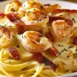 Craving something rich, comforting, and absolutely unforgettable? This Chicken and Shrimp Carbonara brings together tender, golden-seared chicken and succulent shrimp in a velvety parmesan cream sauce, loaded with crispy pancetta and tossed with pasta to perfection. Inspired by Olive Garden’s iconic dish, this easy dinner recipe is ideal for cozy nights in or impressive weekend meals. It’s a fusion of classic carbonara with a luxurious twist — perfect for fans of quick yet indulgent food ideas, weeknight dinner ideas, or anyone looking for a high-impact easy recipe with minimal fuss. Every creamy, savory bite delivers layers of flavor and irresistible texture. Let this restaurant-style pasta be your next go-to favorite for both comfort and celebration.