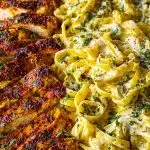 Slice the rested chicken into strips and layer it over the creamy linguine. Let it sit in the pan for a couple of minutes to soak up some of the sauce’s flavor. Garnish with freshly chopped parsley.