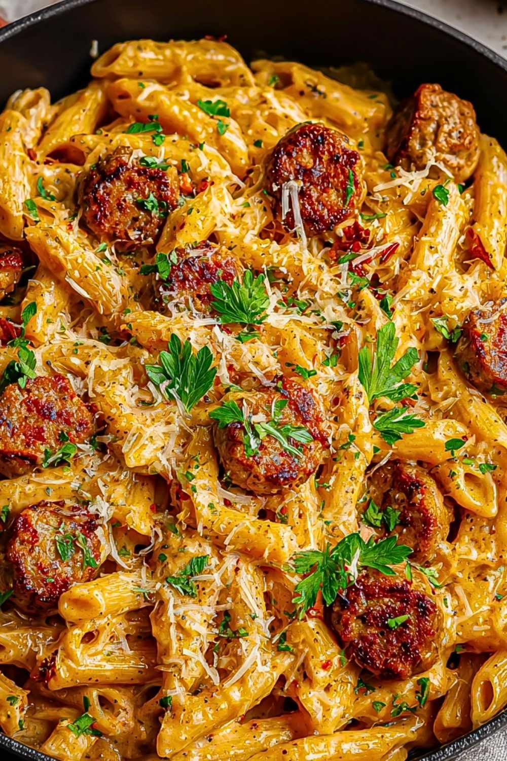 Cook Time: Once the sausage is browned and everything is in the pot, it takes around 15 minutes for the pasta to cook and the sauce to thicken. From pan to plate, this meal is ready in about 25–30 minutes total, making it a perfect quick dinner solution.