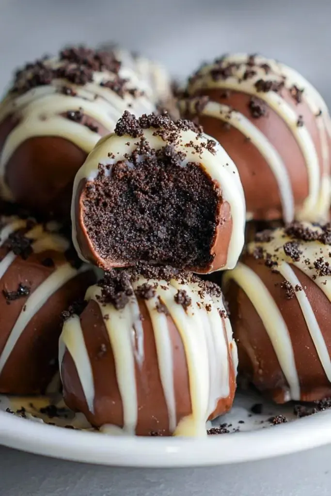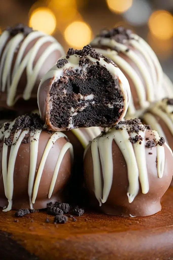 These Oreo Truffles are rich, creamy bites of bliss that combine the irresistible crunch of chocolate cookies with the smoothness of cream cheese and a luxurious chocolate coating. The contrast between the dark, fudgy interior and the snap of the chocolate shell creates a mouthwatering treat that’s both elegant and easy to love. Topped with a drizzle of white chocolate and a sprinkle of cookie crumbs, these truffles look just as impressive as they taste.