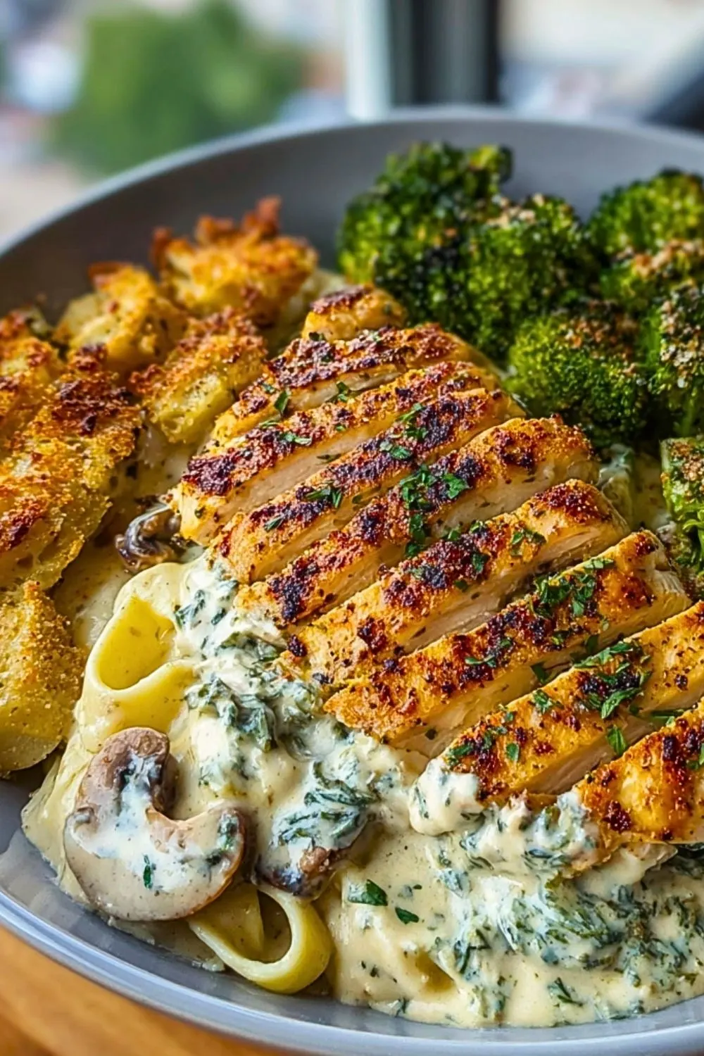 There’s something incredibly satisfying about bringing restaurant-quality meals into your own kitchen, and this Spinach-Artichoke Greek Chicken Alfredo with Crispy Parmesan Broccoli and Mushroom Basil …