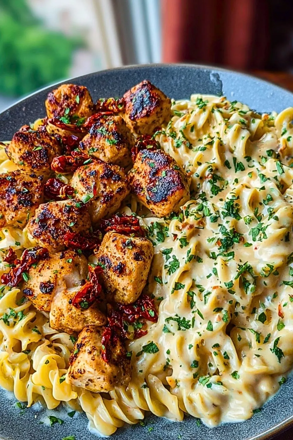 Golden, herb-crusted garlic chicken bites with a rich Tuscan flavor sit atop a bed of creamy, Cajun-spiced Alfredo rotini. Add in sun-dried tomatoes for a …