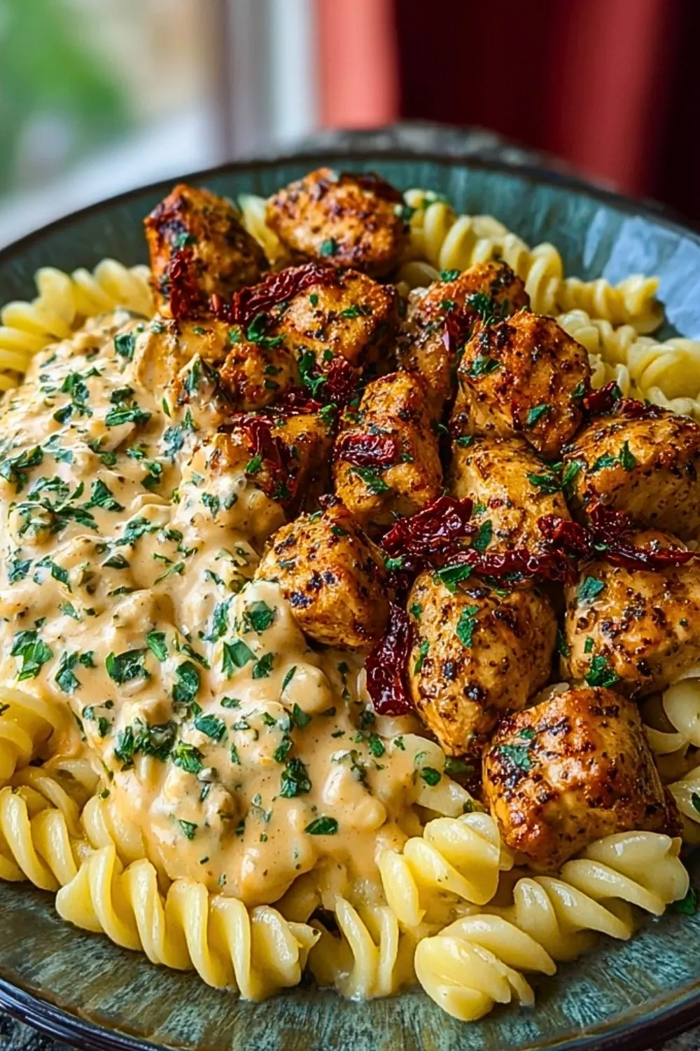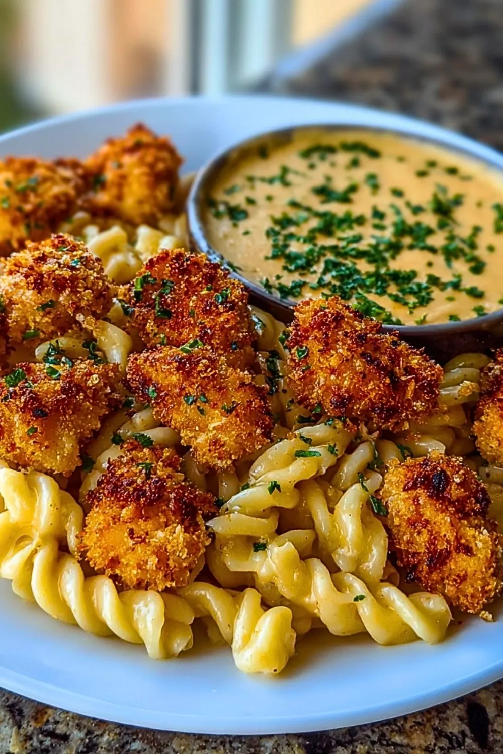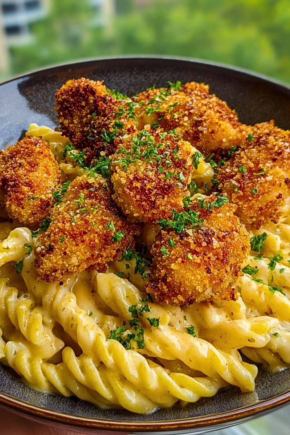 Golden, juicy chicken bites with a parmesan crust—crispy on the outside, tender on the inside—paired with creamy smoked Cajun Alfredo sauce coating every twist of …