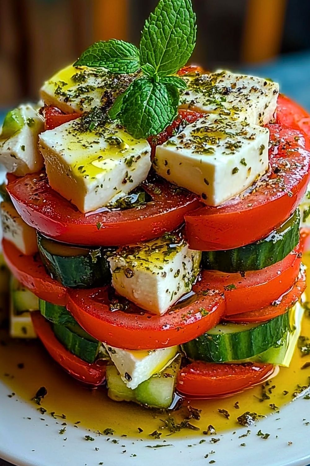 Crisp cucumber slices, vibrant tomatoes, and creamy feta cheese stacked in an elegant tower — this Greek Feta Salad Tower isn’t just a salad, it’s …
