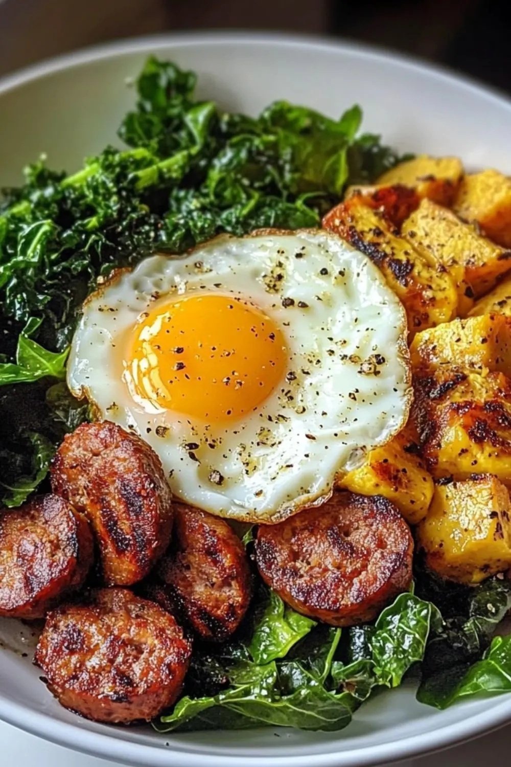 A hearty bowl of goodness that fuels both body and soul — the Savory Breakfast Power Bowl with Sausage, Eggs & Greens is the kind …