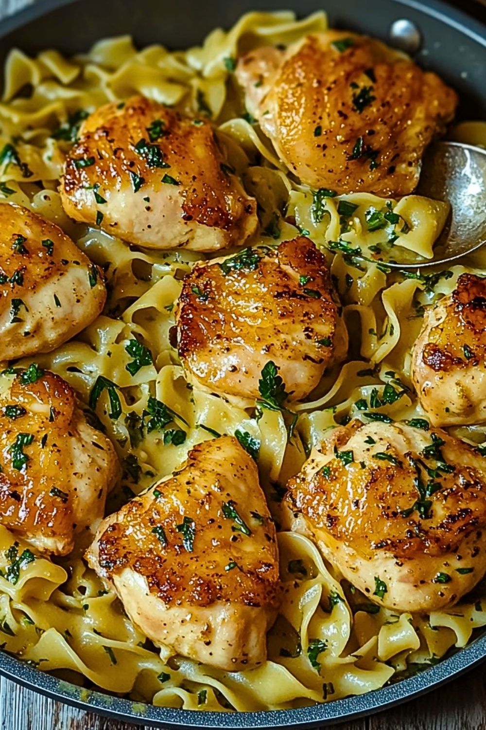 Golden seared chicken nestled on a bed of silky, butter-coated egg noodles—it’s the kind of comfort food that feels like a warm hug at the …