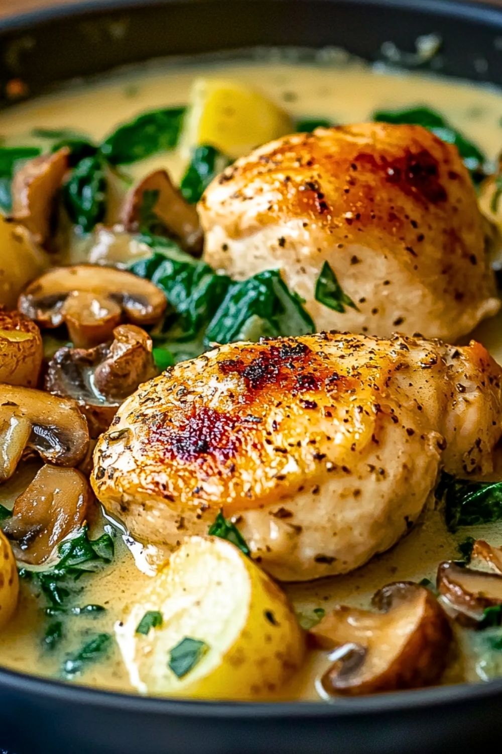 Golden-seared chicken thighs rest in a luxurious, creamy garlic sauce, nestled between tender baby potatoes, hearty mushrooms, and vibrant spinach. This skillet masterpiece is more …