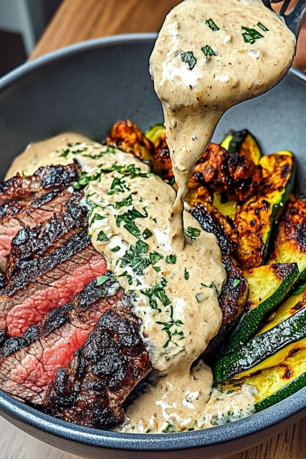 Grilled Steak Bowl with Creamy Sauce & Grilled Zucchini