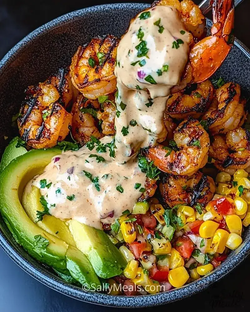 Smoky, juicy grilled shrimp take center stage in this vibrant bowl, nestled next to creamy avocado slices, zesty corn salsa, and a velvety chipotle-style sauce. …