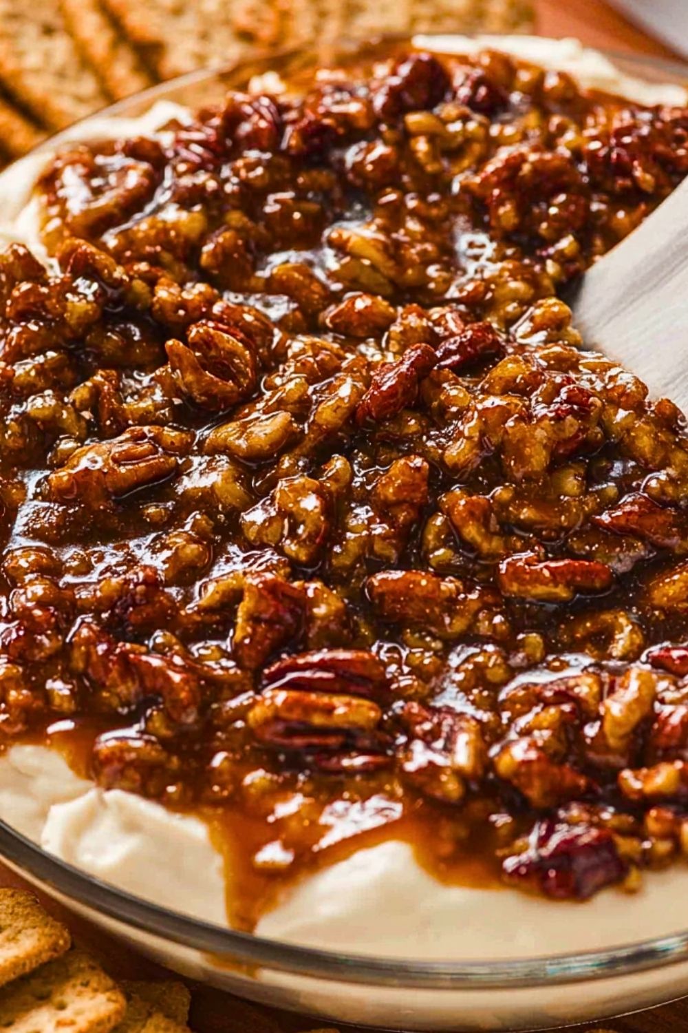 - Let the Topping Cool Slightly: Don’t pour the hot pecan mixture directly onto the cream cheese — wait until it’s warm but not hot to avoid melting the base.