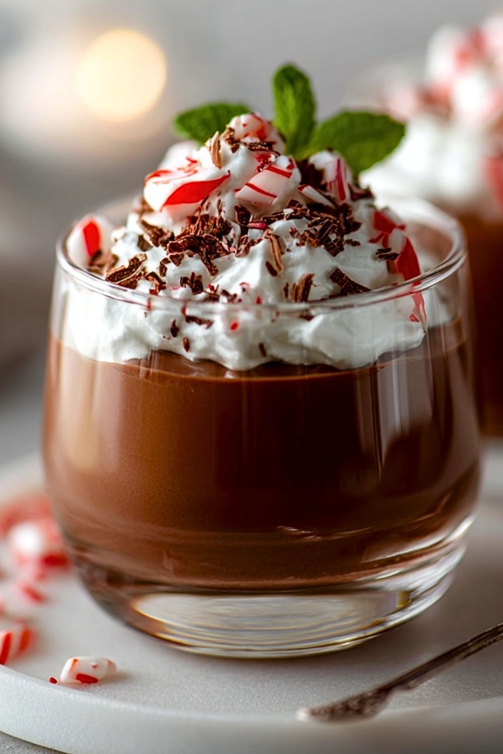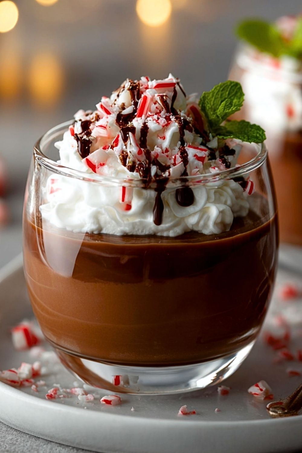 Spoon a layer of pudding into each serving glass. Add a layer of whipped cream, sprinkle crushed candy canes, and repeat as desired. Finish with a final swirl of whipped cream, more crushed peppermint, and a drizzle of chocolate syrup or a few shavings.