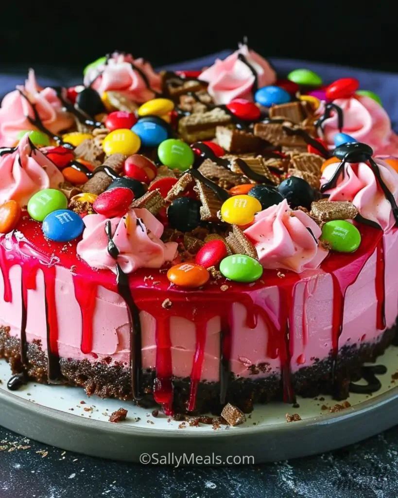 Pink Paradise No-Bake M&M Snickers Cheesecake
