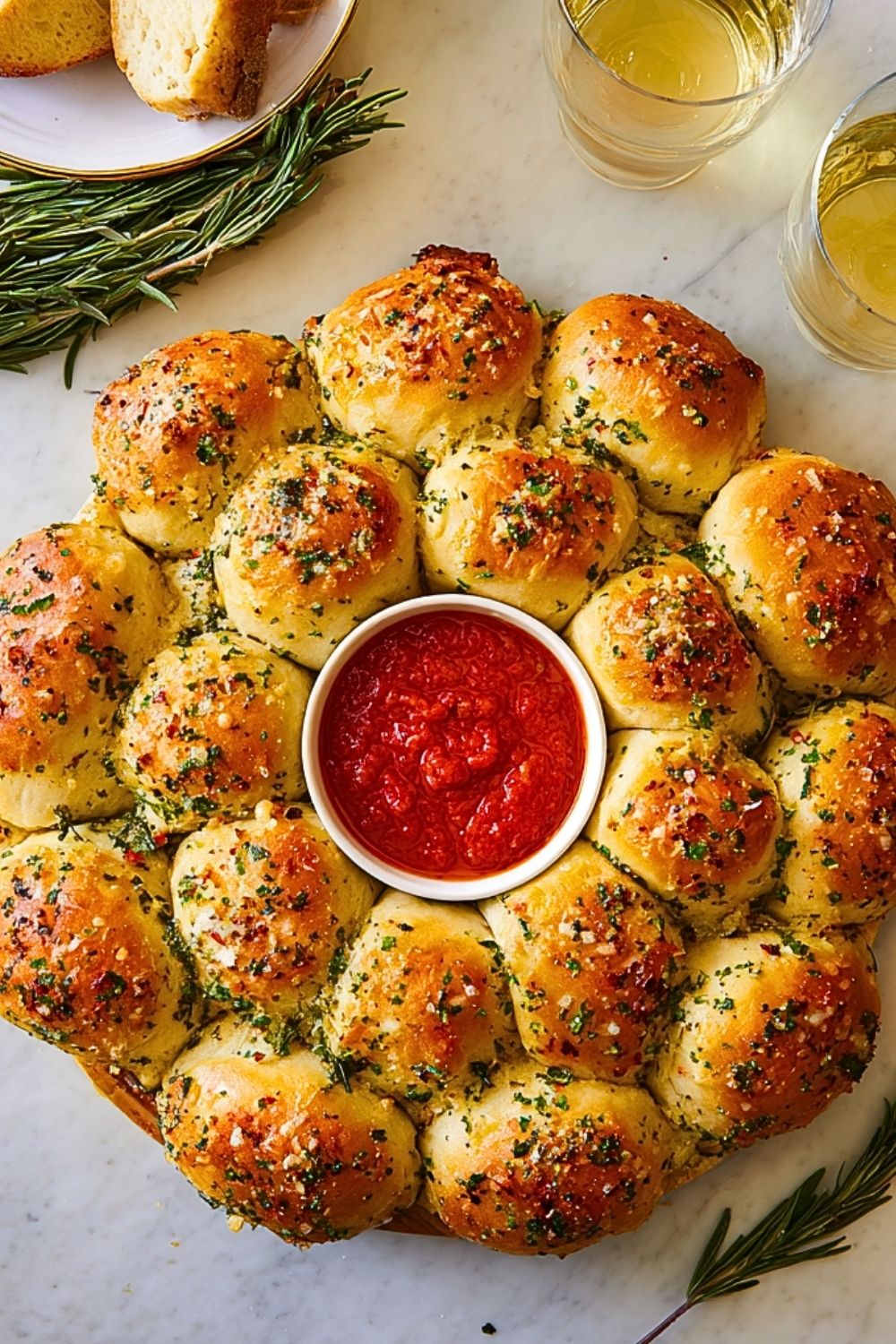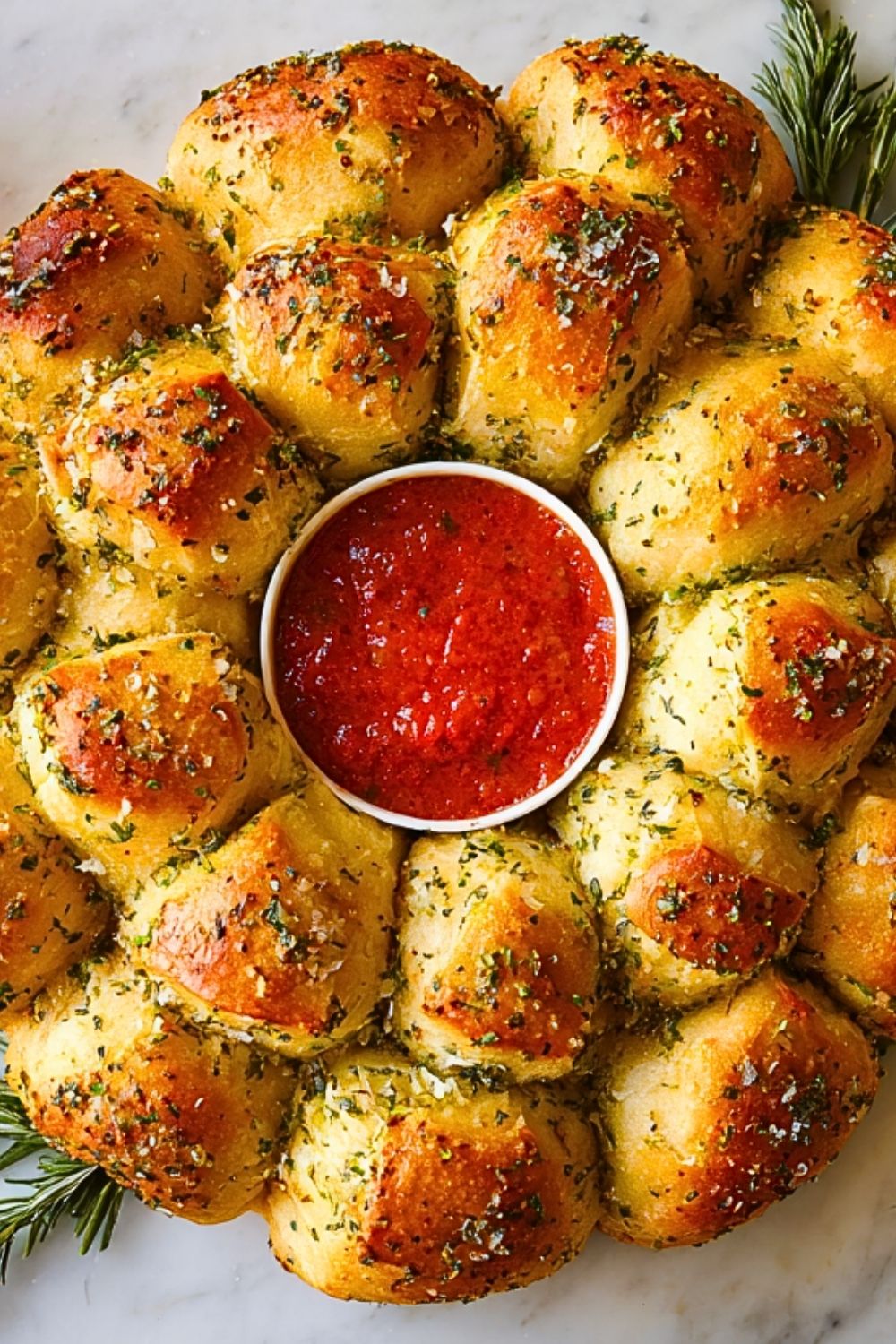 After removing from the oven, brush with any remaining garlic butter. Let it cool for 5 minutes. Place a bowl of warmed marinara sauce in the center and garnish with extra herbs or rosemary sprigs tucked around the wreath for presentation.
