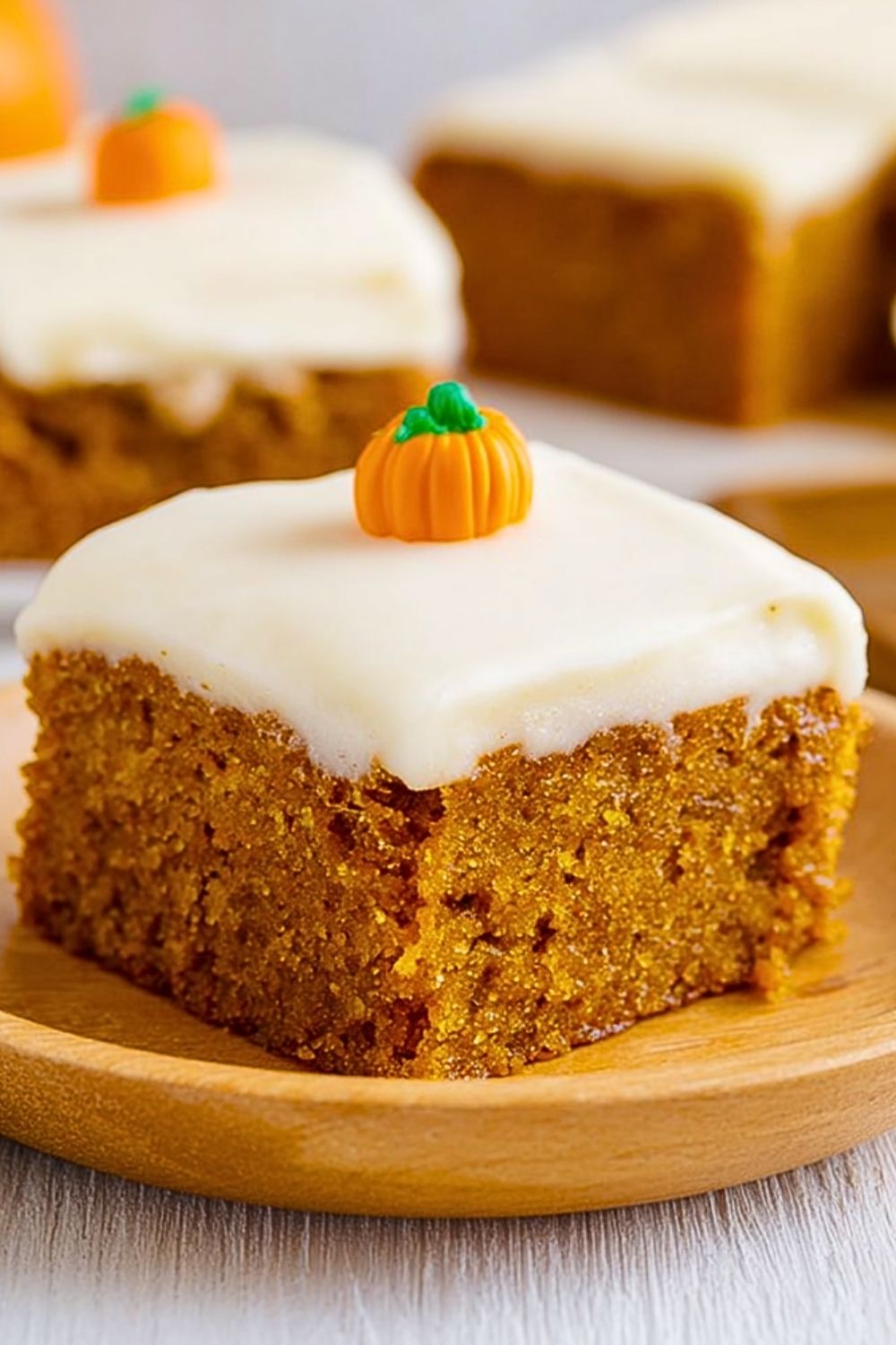 Once the bars are completely cooled, spread the cream cheese frosting evenly over the top. For a festive touch, you can add candy pumpkins or a sprinkle of cinnamon.