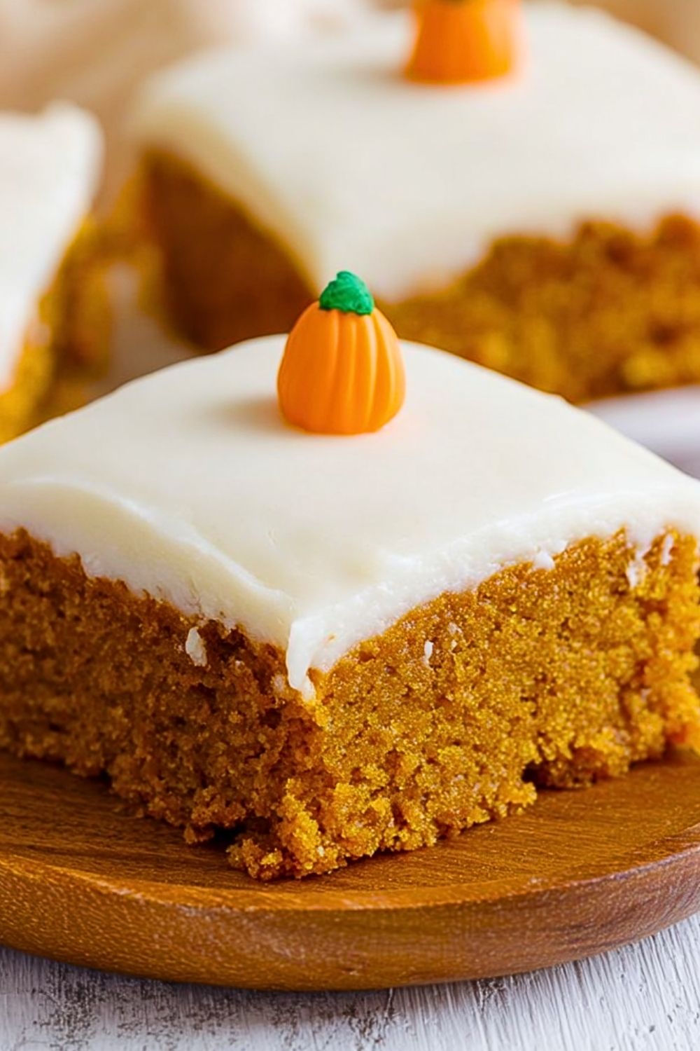 10. Slice into squares and serve. Optionally top with candy pumpkins or cinnamon dust.