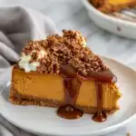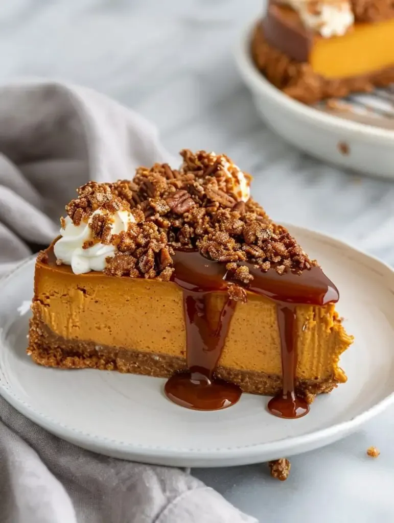 This cheesecake isn’t just about taste—it’s a showstopper dessert that looks as impressive as it tastes. The vibrant orange of the pumpkin layer, contrasted with the golden praline topping and glossy maple drizzle, makes it an irresistible centerpiece for your dessert spread.