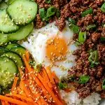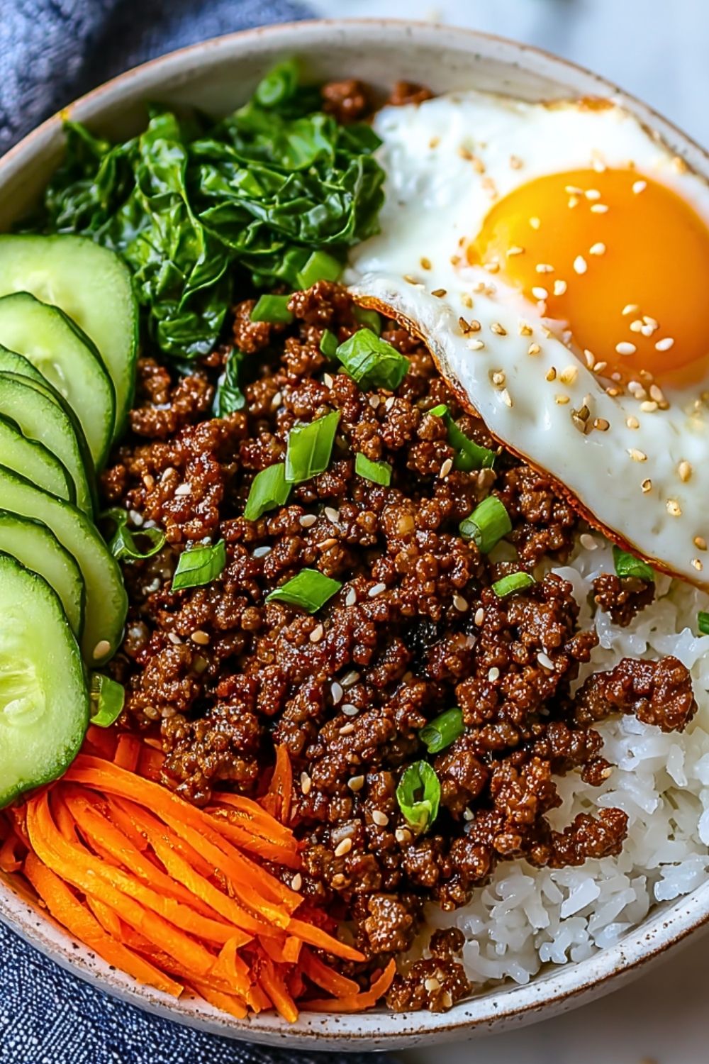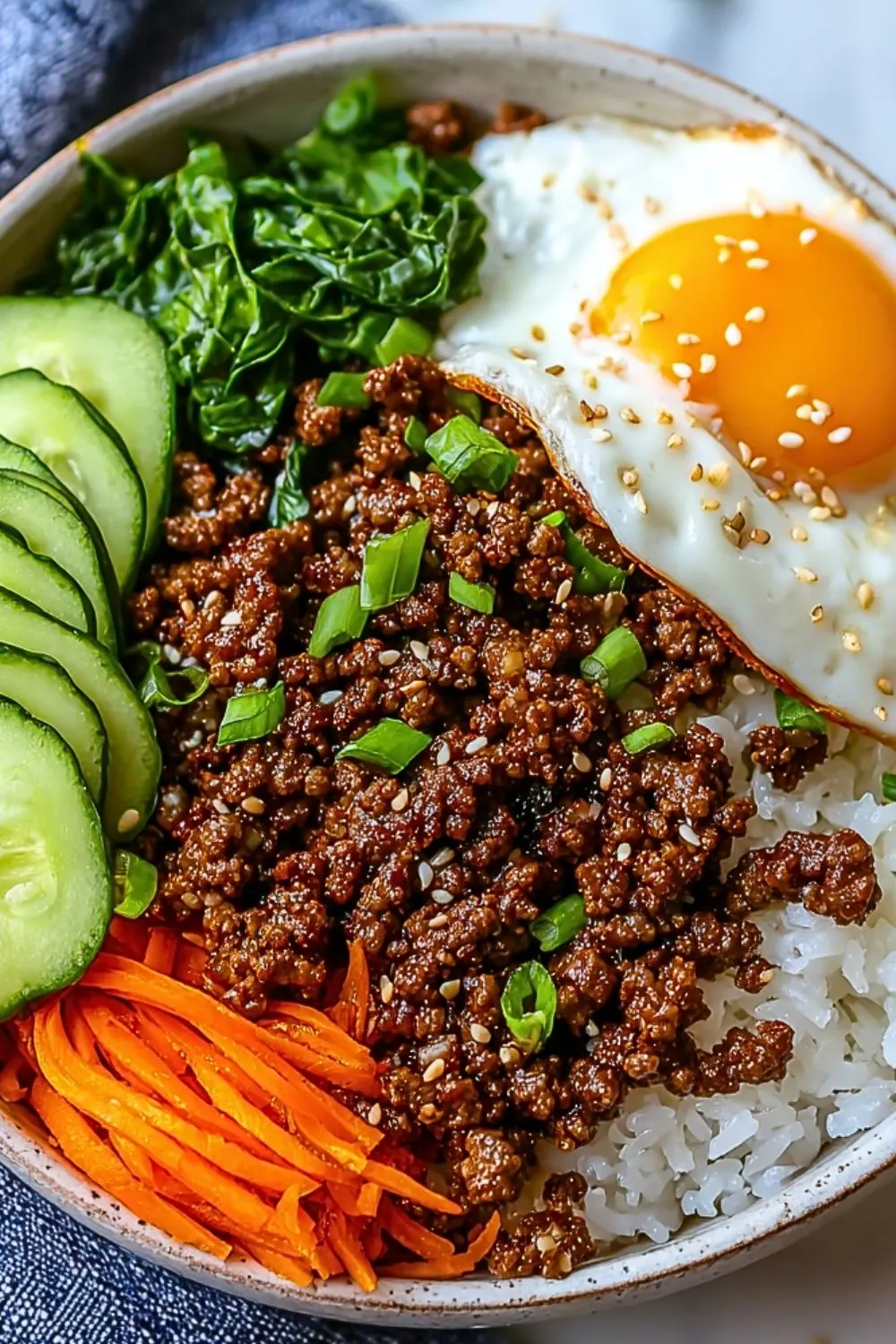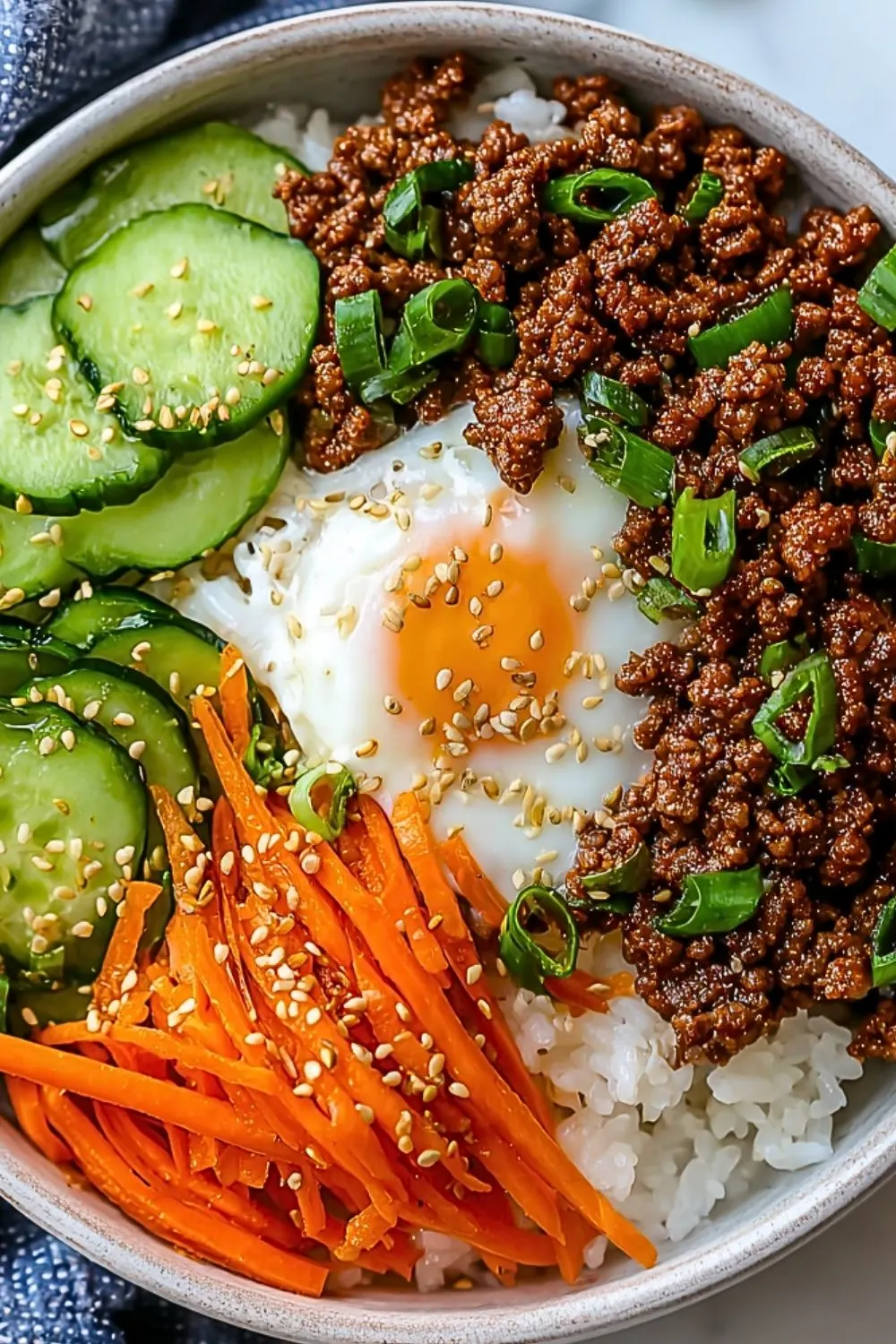 Scoop a generous portion of rice into each bowl. Top with a big spoonful of the Korean ground beef, then arrange sliced cucumbers and carrots around the edge. Sprinkle green onions and sesame seeds over everything.