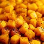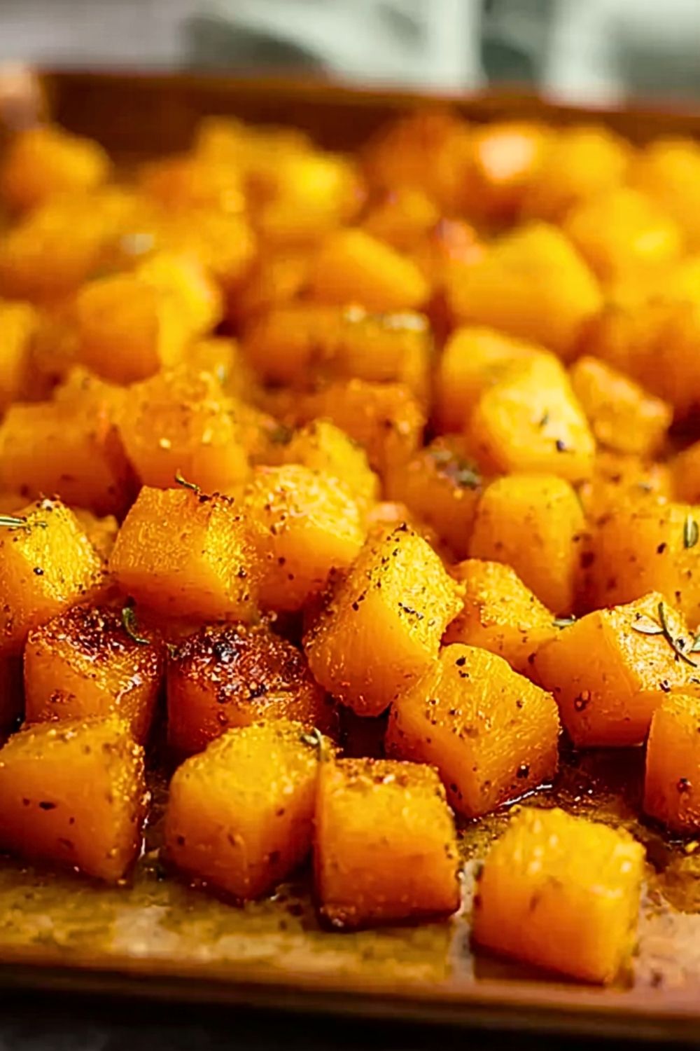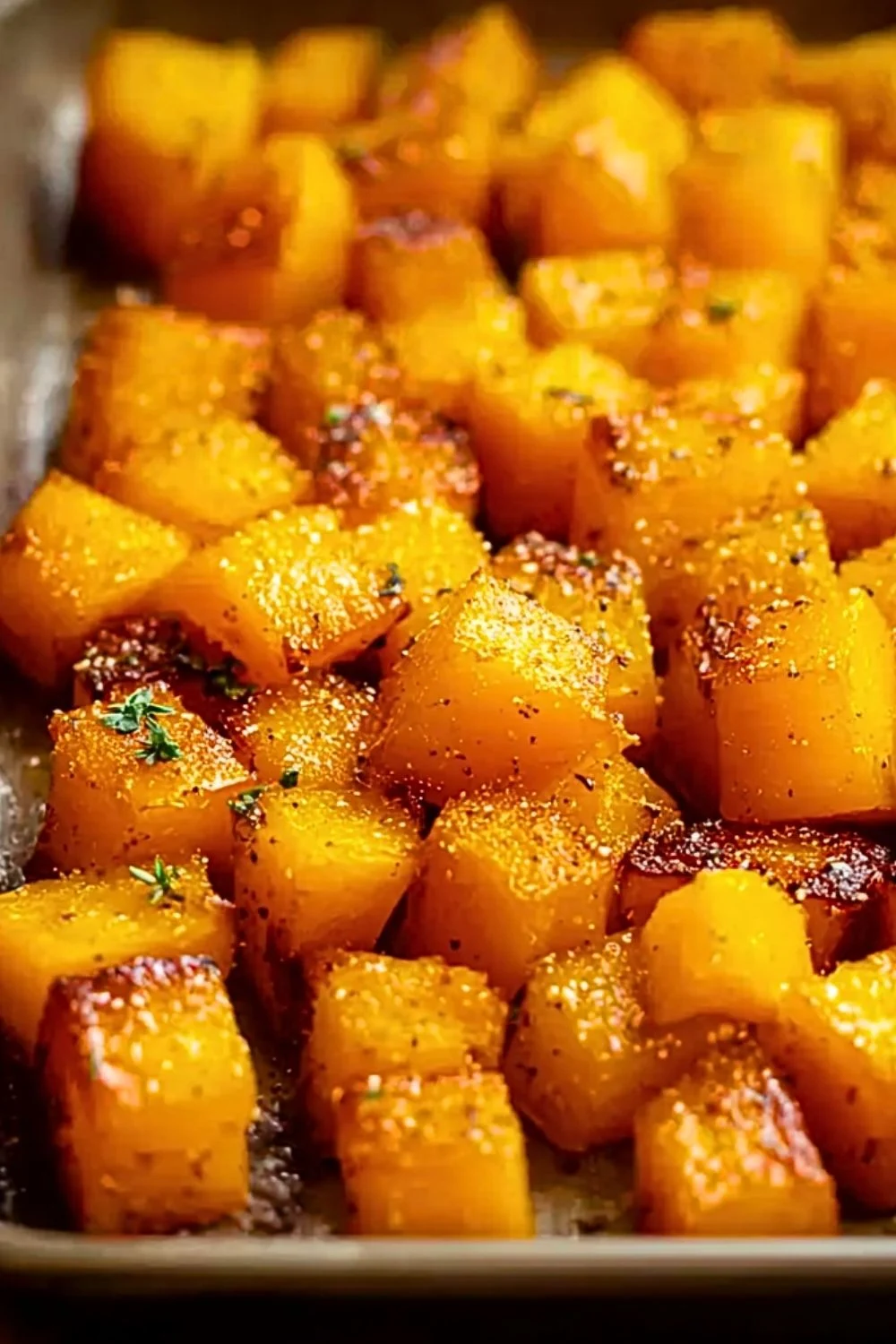 Roast in the preheated oven for 25 to 30 minutes, flipping the cubes halfway through for even browning. The squash is done when the edges are golden and slightly crisp, and the centers are fork-tender.
