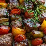 These Rosemary Garlic Steak Kebabs are a perfect fusion of bold flavors and grilled goodness. Juicy, marinated steak cubes are paired with sweet cherry tomatoes and crisp bell peppers, all threaded onto skewers and kissed by fire until perfectly charred. It’s an easy yet impressive dish that brings the rustic comfort of rosemary and garlic right to your backyard grill.