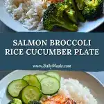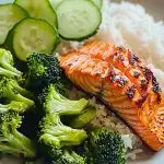 - Assemble the plate: rice first, then salmon, broccoli, and cucumber. Drizzle with pan juices or a vinaigrette.