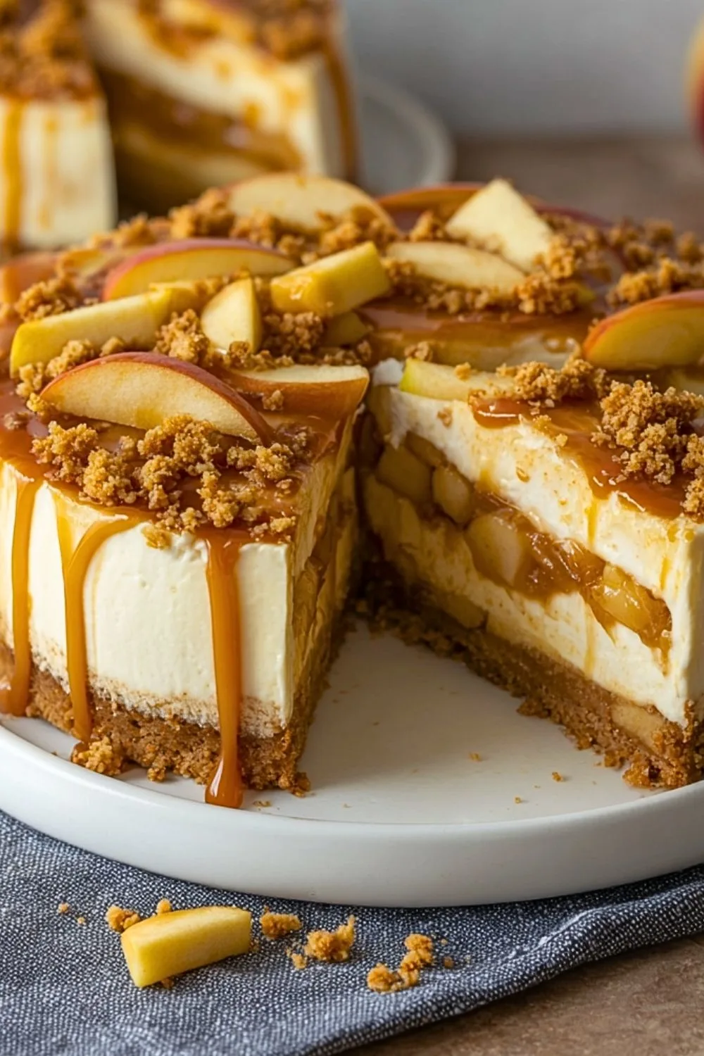 Keywords: cheesecake, caramel apple, fall dessert, holiday recipe, apple pie cheesecake, easy dessert