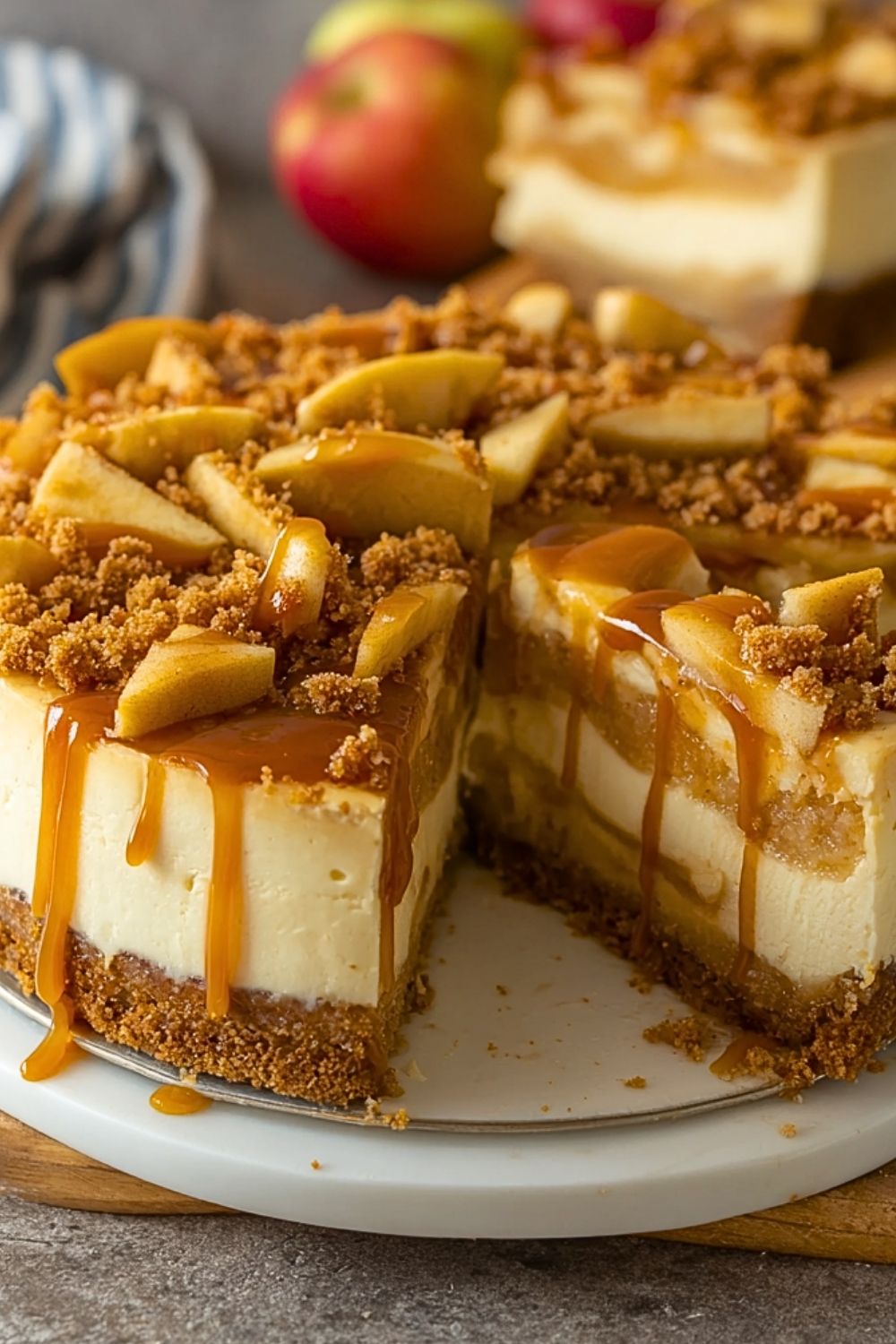 Keywords: cheesecake, caramel apple, fall dessert, holiday recipe, apple pie cheesecake, easy dessert
