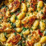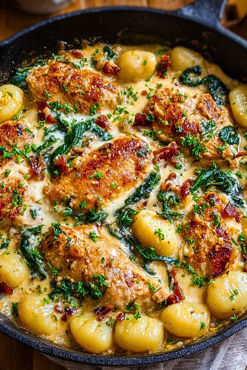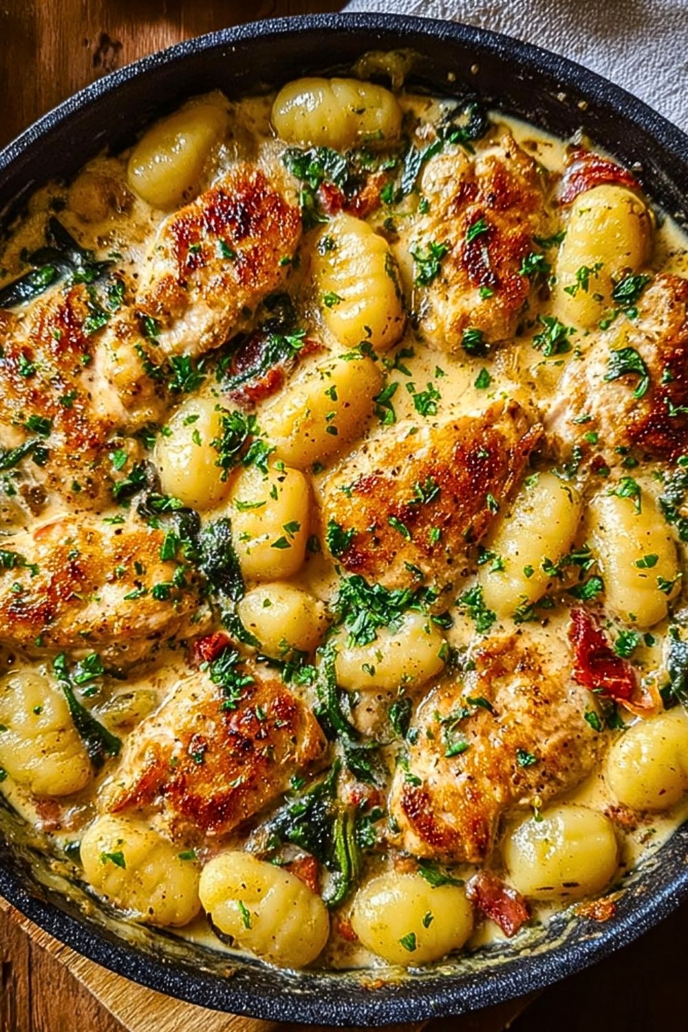 9. Return chicken and gnocchi to the skillet. Stir gently to coat everything in the sauce. Simmer for another 2–3 minutes.
