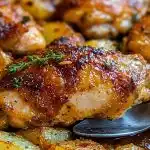 Typically, this dish takes about 35 to 45 minutes in a preheated 400°F (200°C) oven. The exact time will depend on the size of your chicken thighs and potato pieces. You’ll know it’s ready when the chicken reaches an internal temperature of 165°F (74°C), the skin is crisp, and the potatoes are fork-tender with beautifully golden edges.