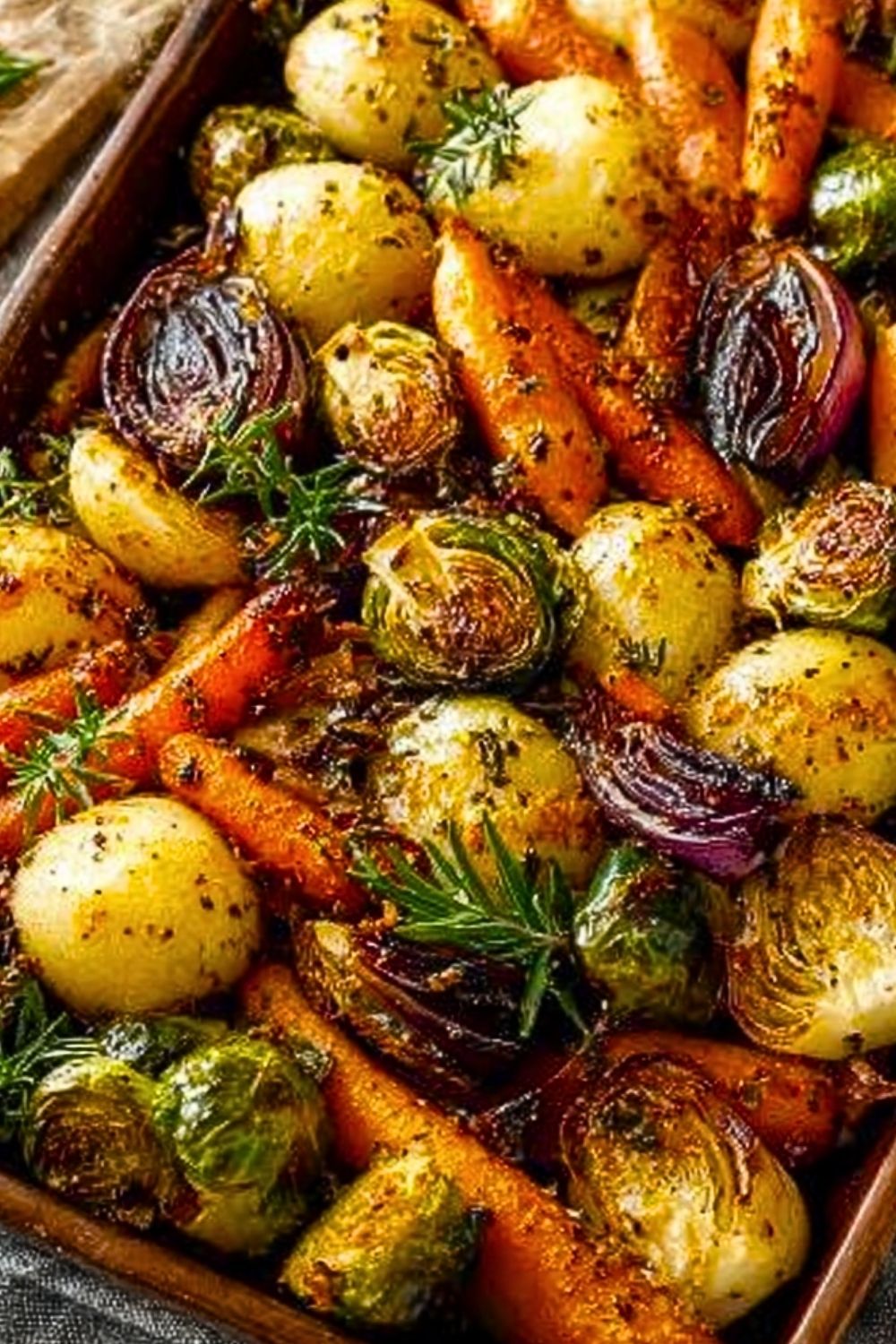 Vegetables are ready when they are fork-tender with golden-brown, crispy edges. Potatoes should be soft inside, and Brussels sprouts should have slightly charred outer leaves for maximum flavor.