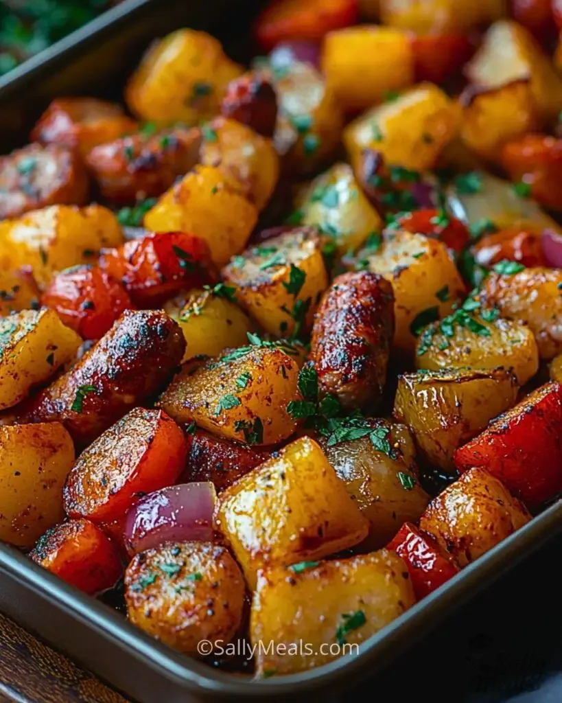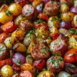 A quick and easy one-pan meal featuring smoky sausage and a colorful mix of roasted vegetables, perfectly seasoned and caramelized for maximum flavor. This dish is perfect for busy weeknights and meal prep!