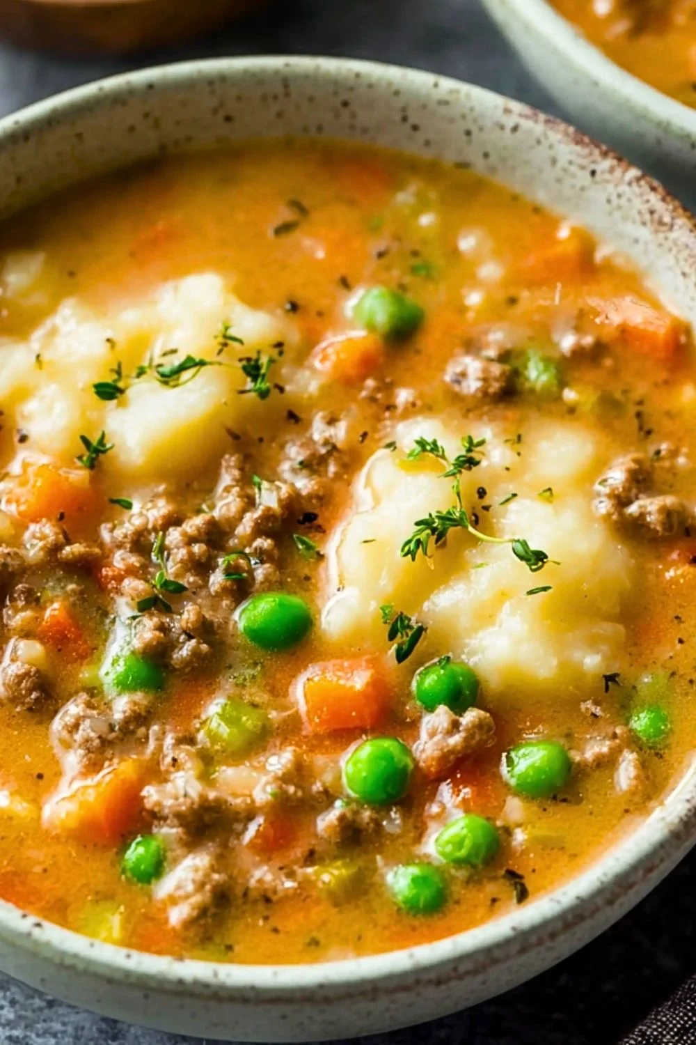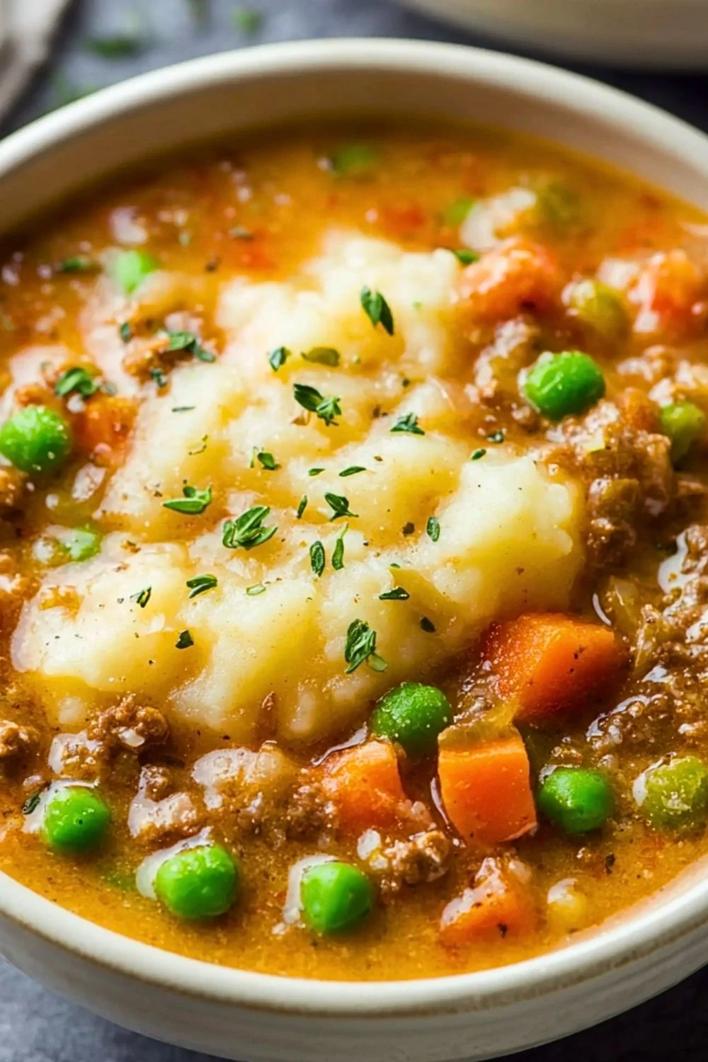 Keywords: shepherd's pie soup, comfort food, easy dinner, ground beef recipe, cozy soup, mashed potato soup