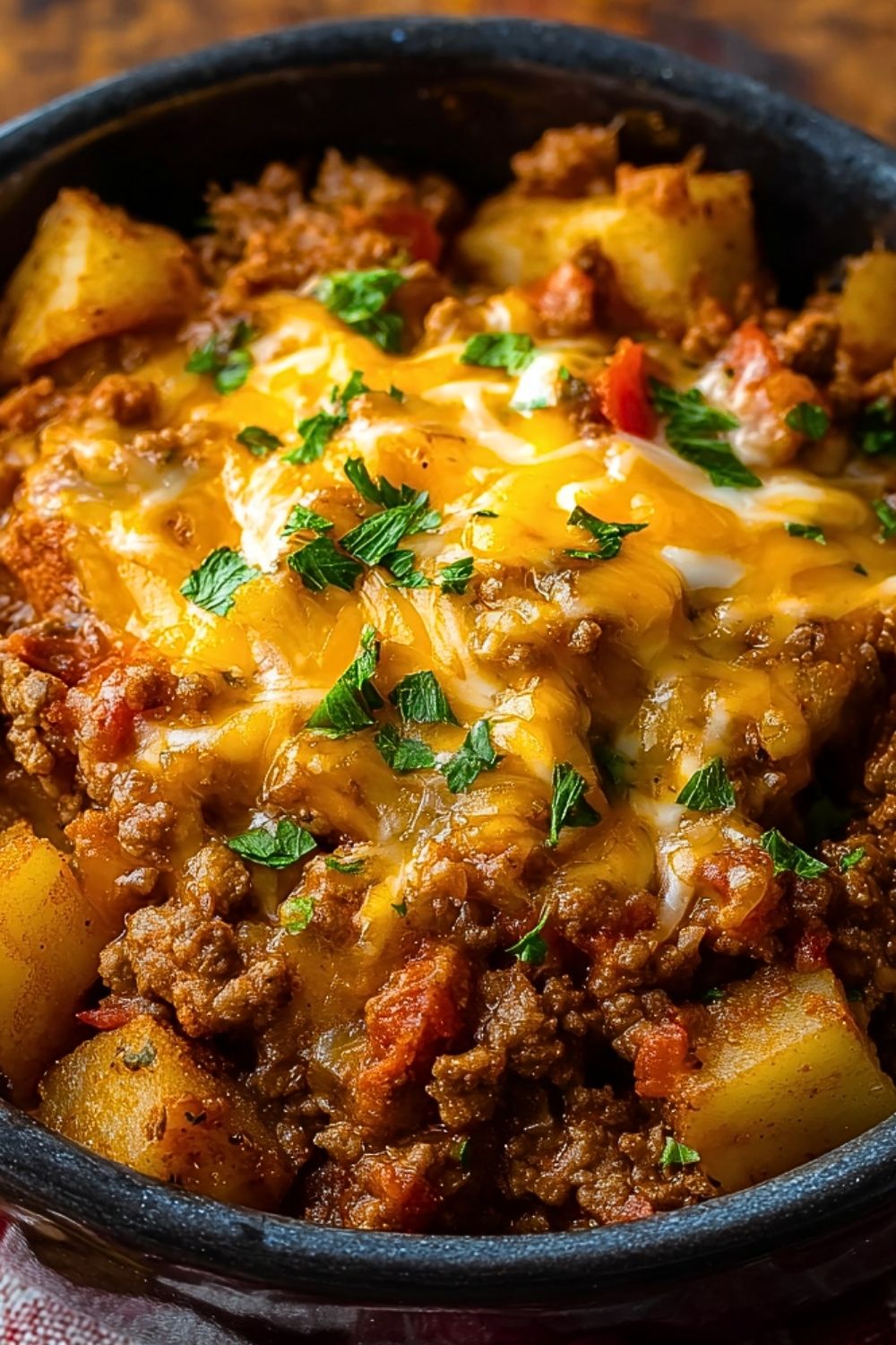The magic of Slow Cooker Cowboy Casserole comes from layering simple, rustic ingredients that slowly cook together over several hours. As the ground beef simmers with tomatoes, beans, and spices, it creates a rich, savory base that seeps into the potatoes.
