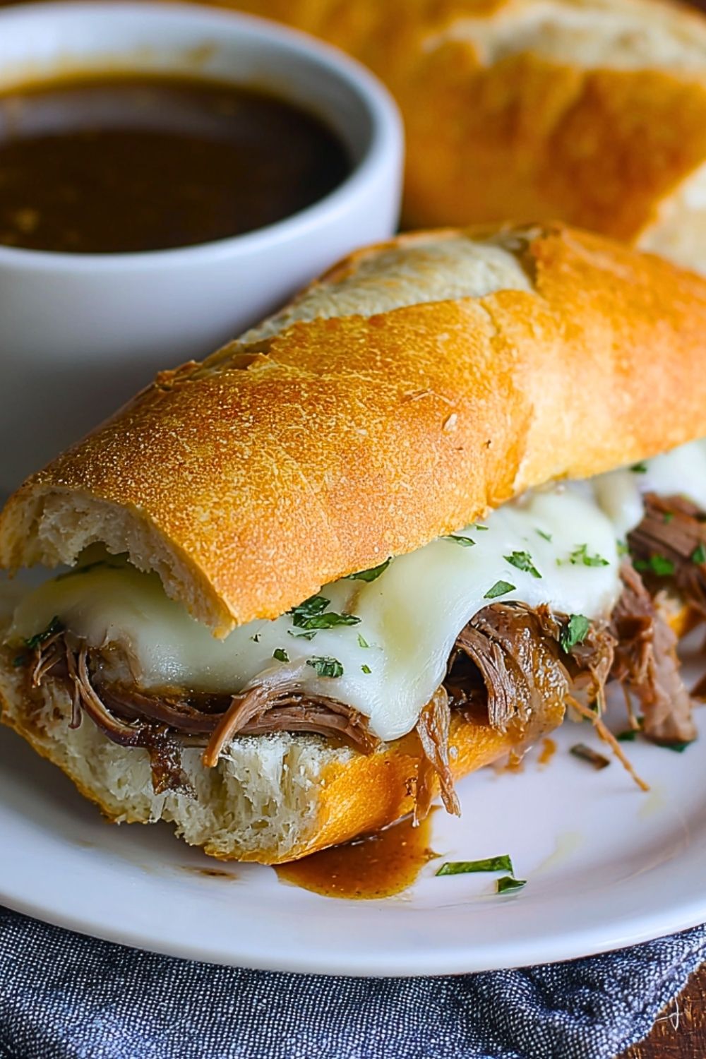 Use a well-marbled chuck roast for the most tender and juicy beef. Sear the meat before placing it in the slow cooker to deepen the flavor (optional, but recommended). Be sure to season your broth with garlic, Worcestershire sauce, and a touch of soy sauce for a complex, umami-rich dip. Toast your bread lightly before assembling the sandwich—this adds structure and prevents sogginess. Finally, don’t skip the au jus dip. That flavorful broth is what transforms this sandwich from good to unforgettable.