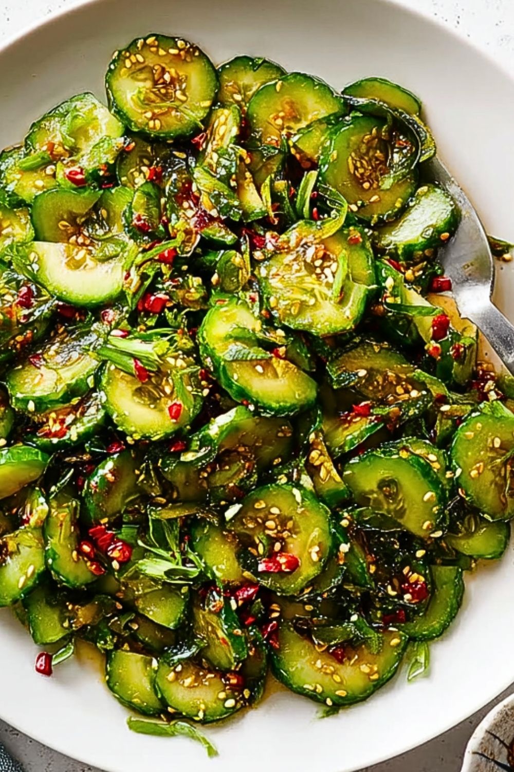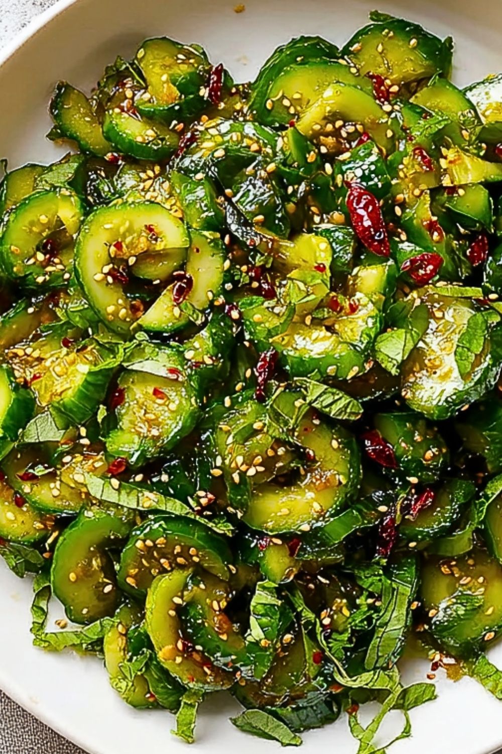Refreshing, crisp, and packed with bold flavors, this Smashed Asian Cucumber Salad is more than just a side dish—it’s a showstopper. The cucumbers are smashed to create rough edges that soak up the savory-sweet dressing infused with garlic, sesame oil, soy sauce, and chili flakes. Each bite offers a satisfying crunch paired with zesty heat and aromatic freshness from herbs and toasted sesame seeds.