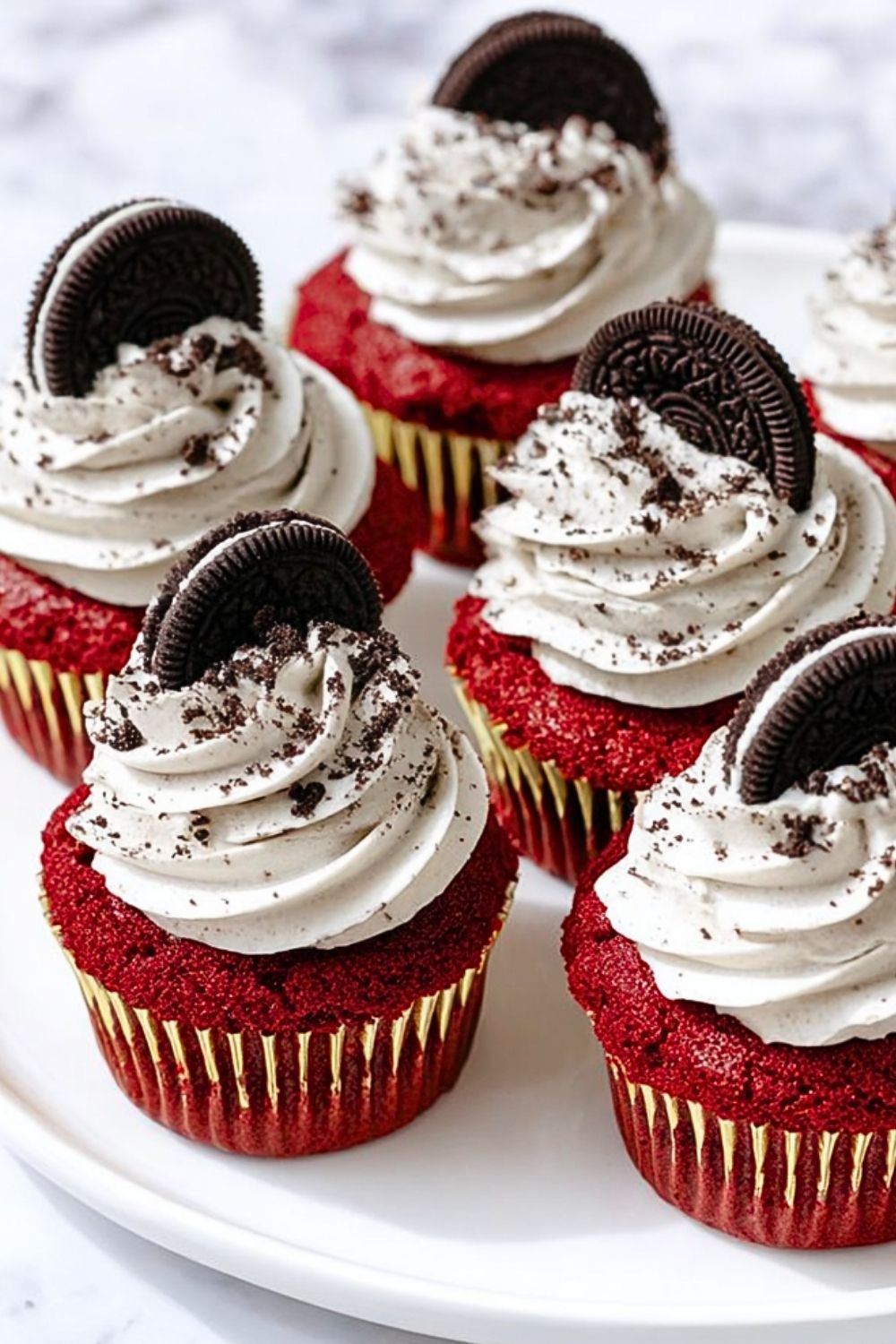 Perfect for celebrations or simply satisfying a sweet craving, these cupcakes stand out with their striking red color and decadent topping. The contrast between the soft cake and the crunchy Oreo garnish creates a dessert that’s as delightful to eat as it is to look at.