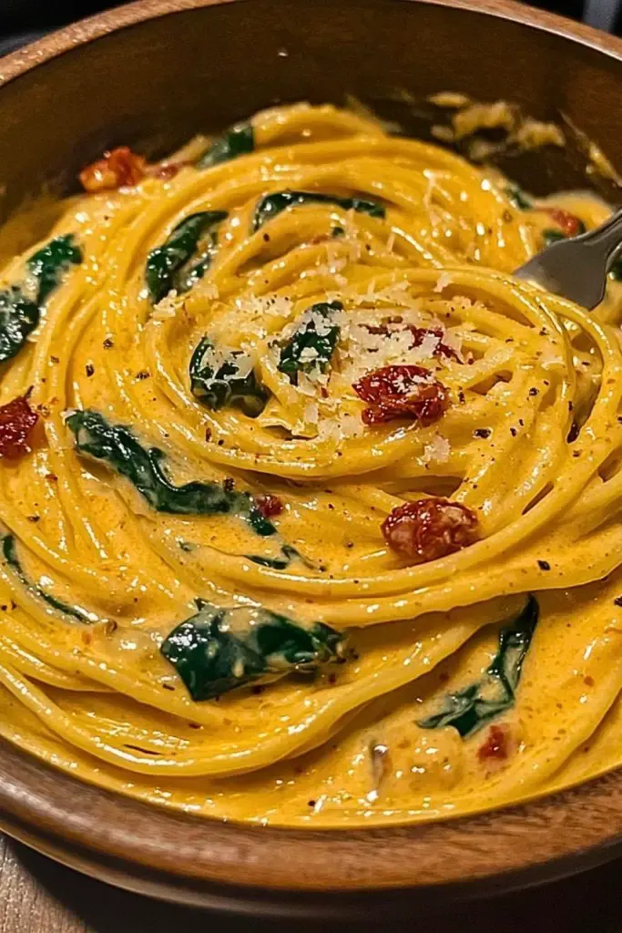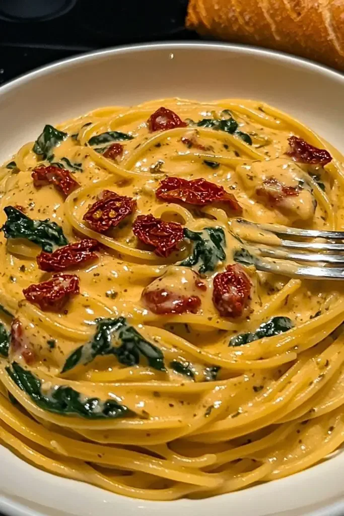 A creamy, comforting pasta dish featuring tender spaghetti, fresh spinach, and tangy sun-dried tomatoes in a luscious Parmesan cream sauce. Quick to prepare and full of flavor, this is an ideal recipe for both busy weeknights and special occasions.