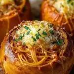 There’s something wildly comforting about the combination of spaghetti, marinara sauce, and a golden, crispy layer of cheese. But imagine all of that deliciousness tucked into a warm, buttery garlic bread bowl—now that’s next-level comfort food. I first tried this idea on a whim, using leftover spaghetti and day-old bread rolls. The result was so irresistible, it became an instant crowd-pleaser in my house.