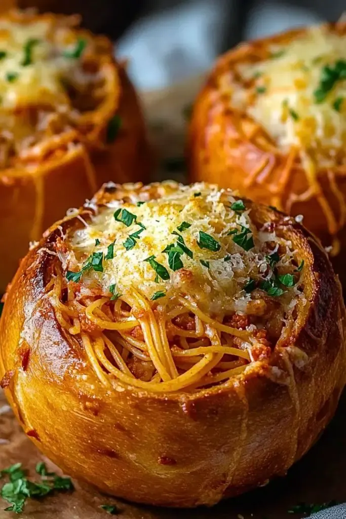 This recipe takes two favorites—spaghetti and garlic bread—and combines them into one epic meal. The crispy, golden crust of the bread bowl contrasts beautifully with the saucy, cheesy spaghetti filling. It’s a fun twist on traditional pasta night that both kids and adults adore. Plus, they’re perfectly portioned, making them ideal for serving at parties or potlucks.
