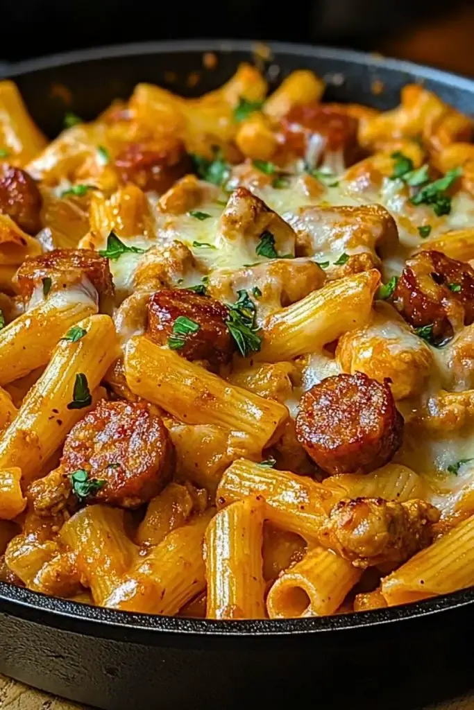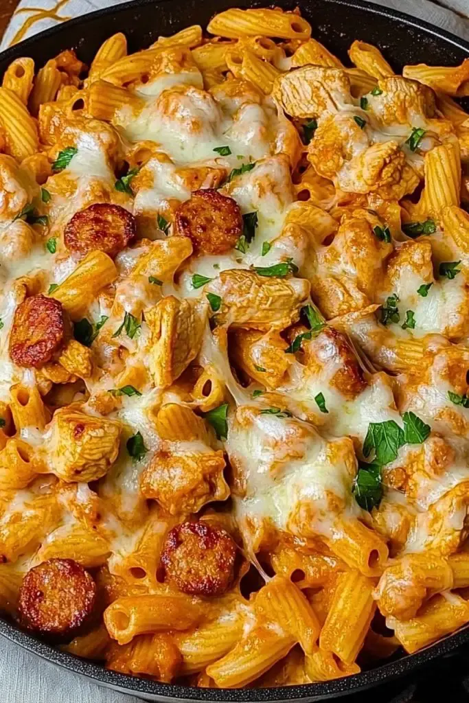 Bring bold flavor to your table with this Spicy Cheesy Chicken & Sausage Pasta Skillet—a fast, one-pan wonder that’s perfect for busy weeknights or indulgent weekend dinners. Featuring juicy chicken, spicy Italian sausage, creamy marinara sauce, and melty mozzarella, this easy dinner recipe is hearty, comforting, and packed with protein. Whether you're looking for new dinner ideas, a quick comfort food fix, or just a go-to easy recipe for meal prep, this dish hits all the right notes. It’s the ultimate blend of cheesy, spicy, and savory, all in under an hour.
