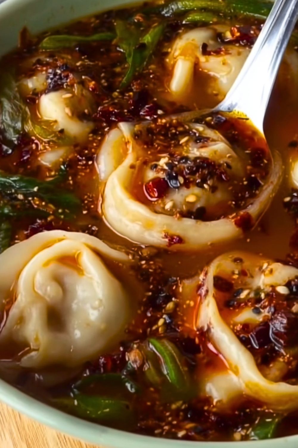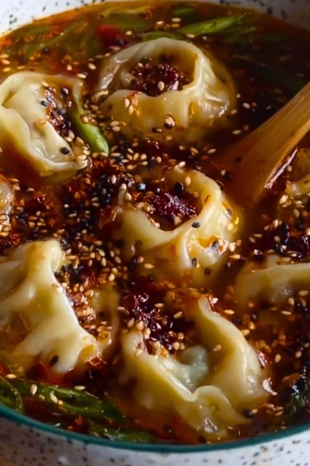 Once the dumplings are fully cooked, turn off the heat. Sprinkle chopped scallions and toasted sesame seeds over the soup. Add a spoonful of chili crisp or an extra swirl of chili oil on top for extra heat and visual appeal.