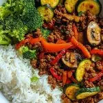Spicy Ground Beef Stir-Fry Bowl with Garlic Veggies & Steamy Rice