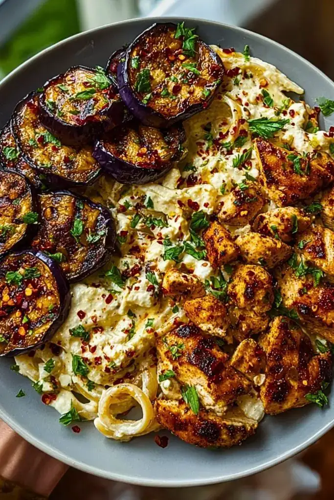 Craving something bold, creamy, and irresistibly savory? This *Spicy Whipped Feta Chicken Alfredo with Crispy Eggplant Wedges & Chili Oil Drizzle* is exactly what your weeknight (or weekend!) dinner needs. It’s a rich and satisfying plate with tender seared chicken, crispy roasted eggplant wedges, and a whipped feta sauce that’s smooth, spicy, and full of flavor. Finished with a fiery chili oil drizzle and fresh herbs, it hits every note. Whether you’re looking for quick dinner ideas, an easy chicken recipe, or a healthyish comfort food twist, this dish has it all.