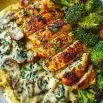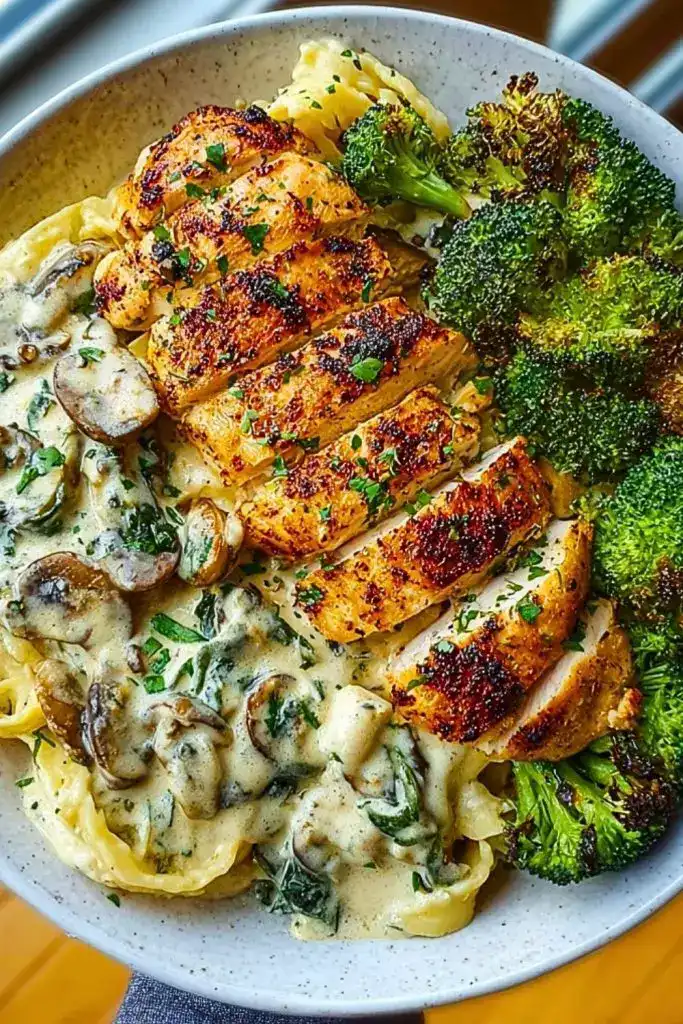 Craving something truly next level for dinner? This Spinach-Artichoke Greek Chicken Alfredo with Crispy Parmesan Broccoli and Mushroom Basil Cream is a flavorful powerhouse and a feast on a plate. Grilled Greek-marinated chicken pairs perfectly with a velvety spinach-artichoke Alfredo, finished with crispy roasted broccoli and golden gnocchi or potatoes. It’s rich, vibrant, and full of textures that balance indulgence with wholesome ingredients. Perfect for easy dinners, cozy nights in, or impressive weekend food ideas. A must-try if you’re after an easy recipe with gourmet flavor!