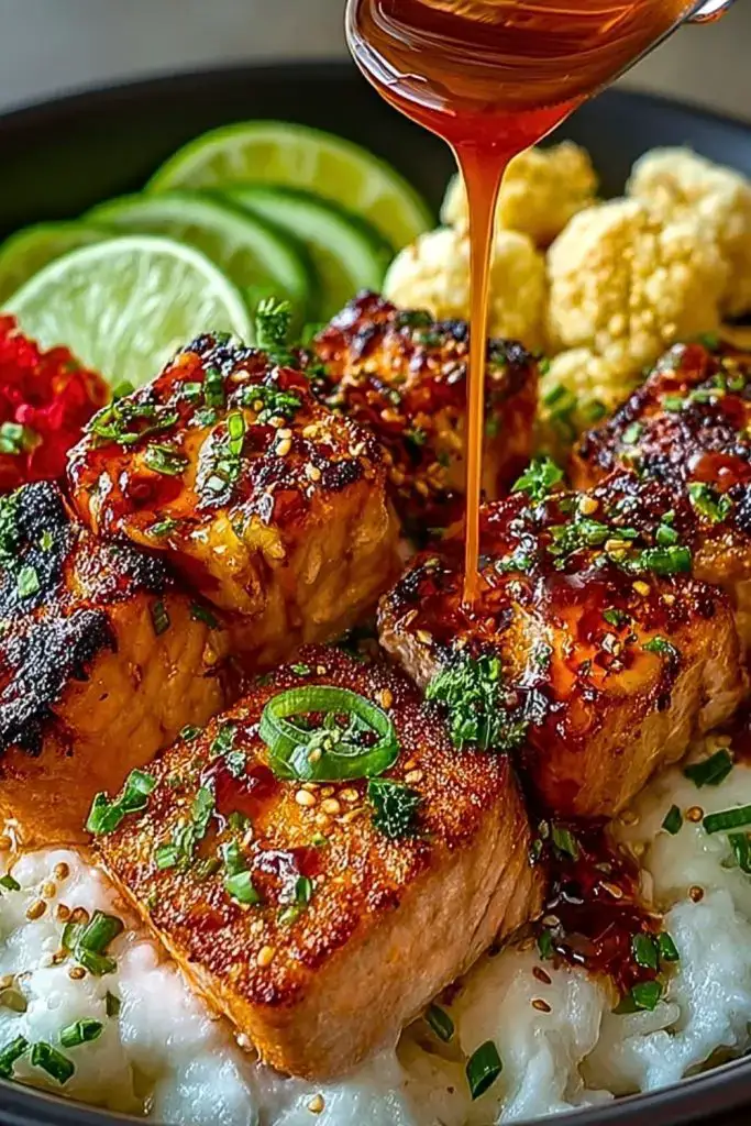 Get ready to fall in love with these Sriracha Honey Salmon Bowls — a vibrant, flavor-packed meal perfect for a quick dinner, healthy lunch prep, or even easy food ideas for any day of the week. Sweet honey, spicy Sriracha, and tender salmon cubes come together in a luscious glaze that will make your taste buds dance. Served over fluffy rice with roasted cauliflower and drizzled in a creamy spicy sauce, this easy recipe is bursting with color, texture, and irresistible flavors. Perfect for when you're craving healthy snacks, dinner ideas, or simple yet gourmet meals. Every bite feels like comfort and celebration rolled into one!