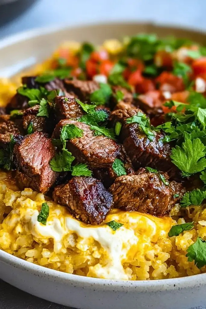 A bold and satisfying bowl that combines tender seared steak with creamy queso-covered rice, topped with sour cream, cilantro, and pico de gallo. It’s easy to customize and loaded with flavor in every bite.