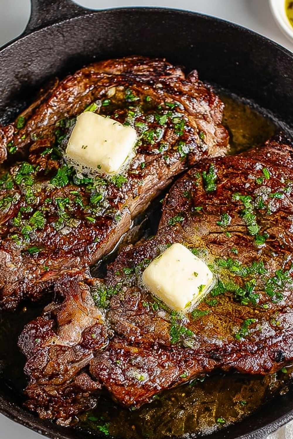 Flip the steaks and cook for another 3–4 minutes for medium-rare, adjusting time as needed based on thickness and desired doneness. In the last 2 minutes of cooking, add butter and fresh rosemary or thyme to the pan. Tilt the pan and baste the steaks with the melted herb butter using a spoon.